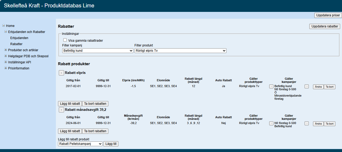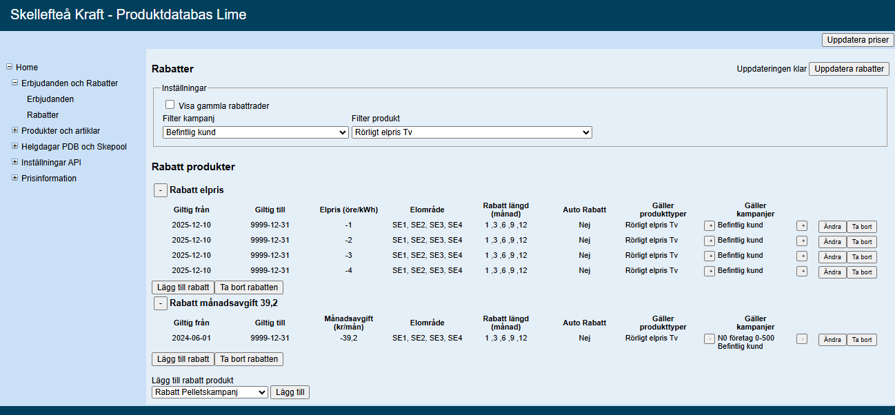 Rabatterna för Rörligt elpris Tv i erbjudande "Befintlig kund" i Produktdatabasen efter ändring: