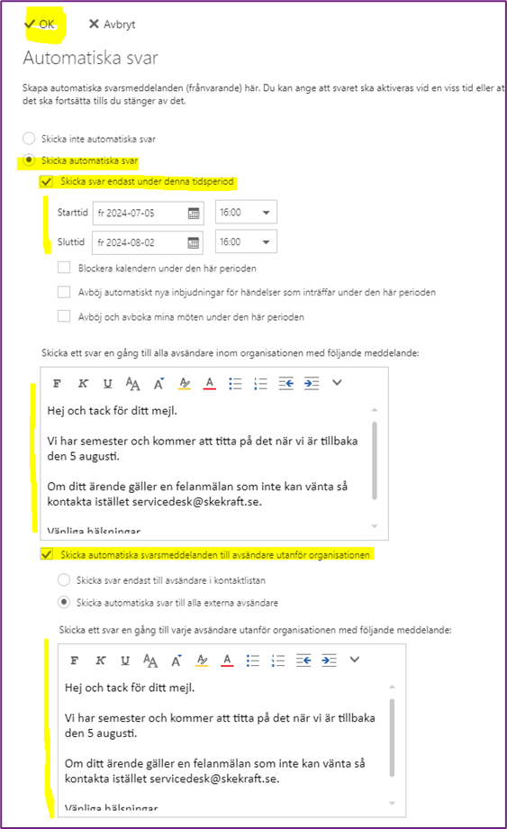 Fyll i den period det ska gälla och vilket autosvaret ska vara. Avsluta med OK!