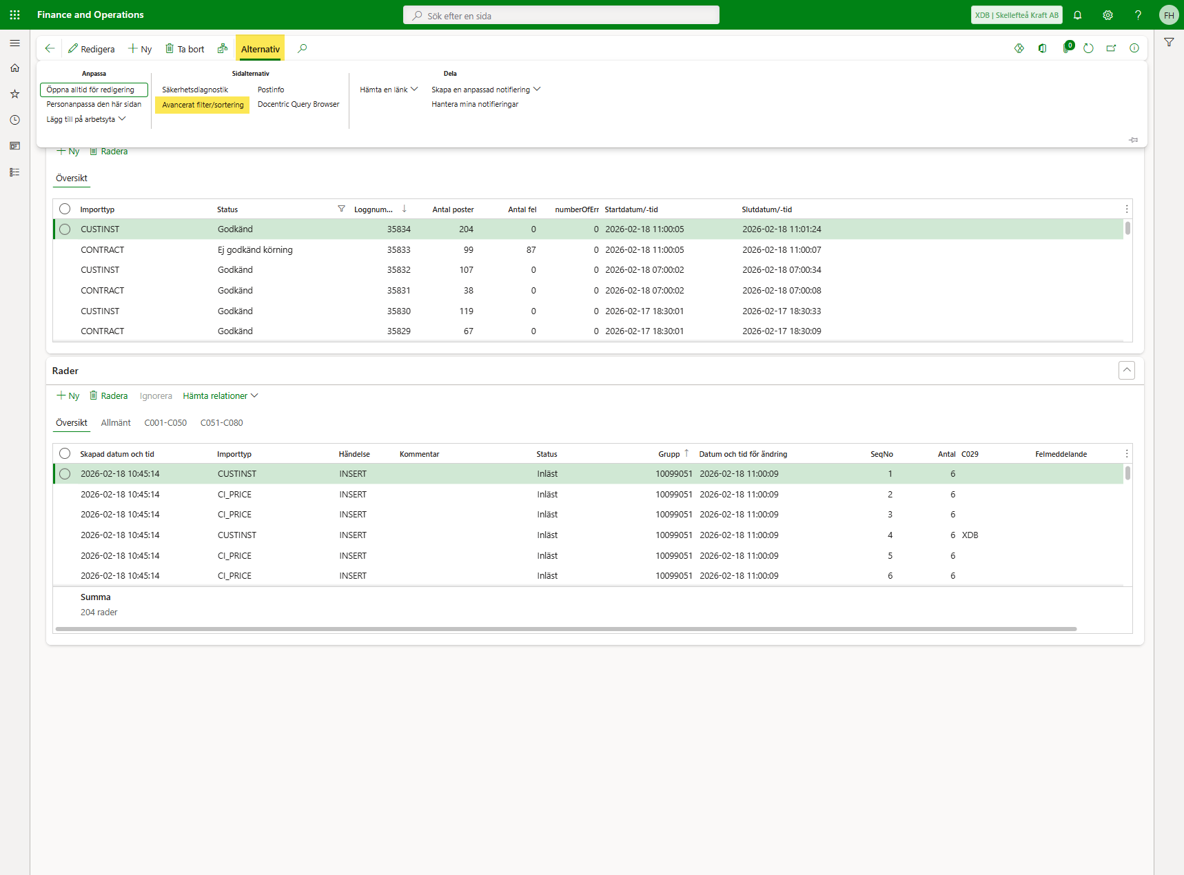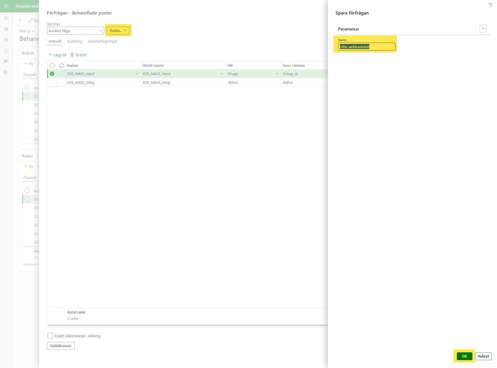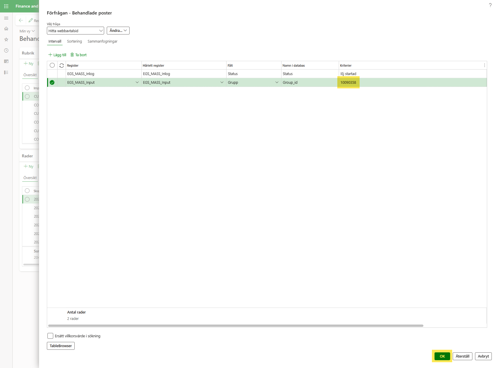 Detta avancerade filter används för att kunna söka på ett webbavtalsid i Behandlade poster i D365 och på så vis få fram logg och rader för det specifika avtalet.