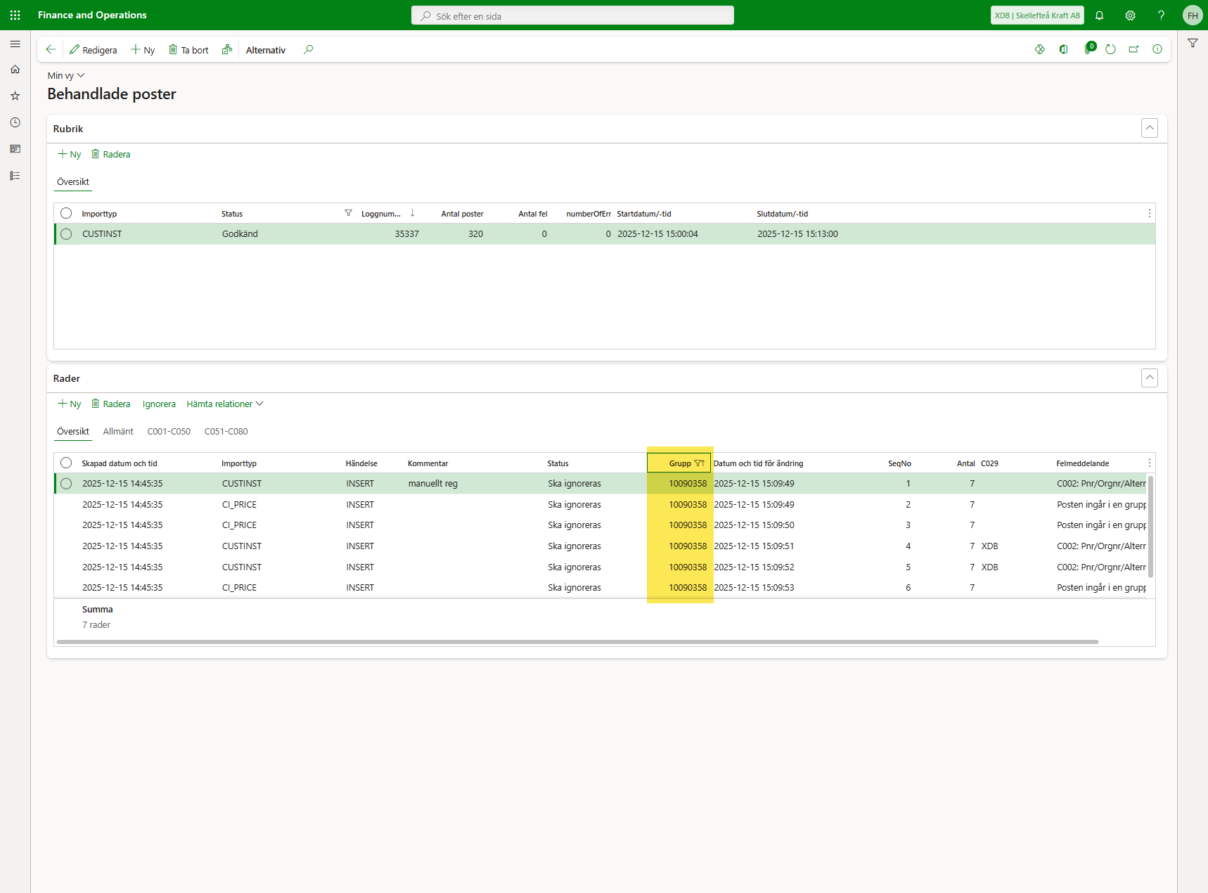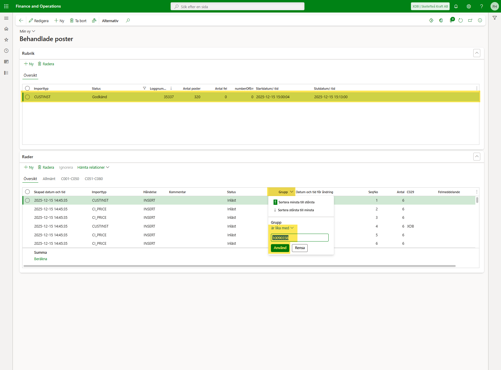 Rätt logg filtreras nu fram i den övre rutan, men för att se enbart de rader som hör till det aktuella webbavtalsid:t behöver du även filtrera en gång till i Kolumnen Grupp: