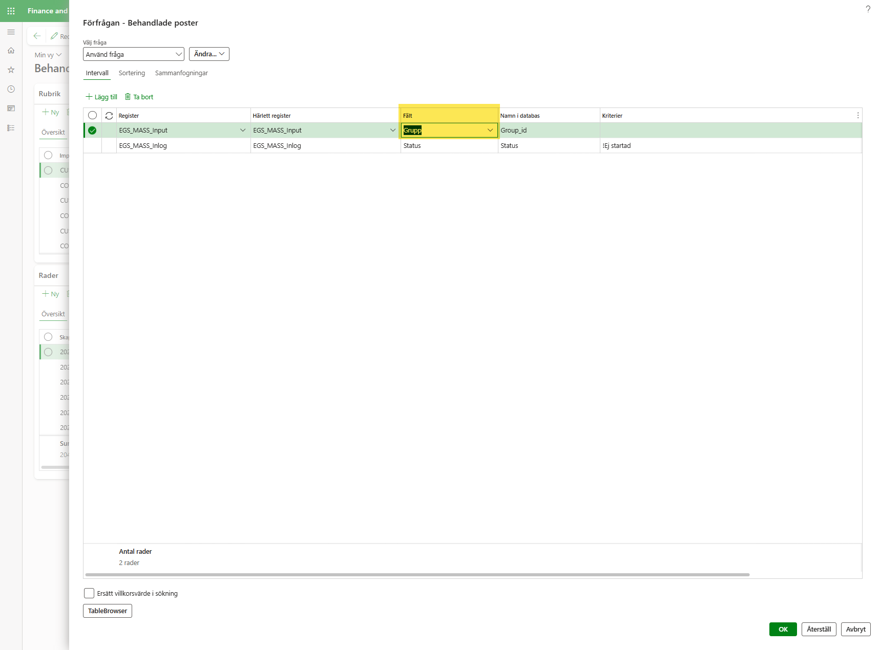 Markera raden EGS_MASS_Input (Loggnummer) och klicka på Välj (OBS! Bocka inte i rutan Not exist join):