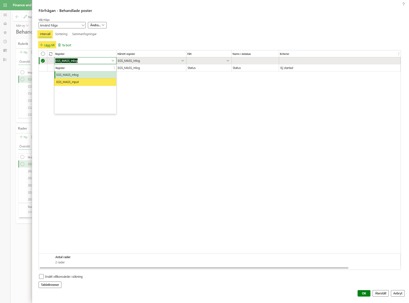 Gå tillbaka till fliken Intervall, klicka på +Lägg till och välj EGS_Mass_Input i rullisten i kolumnen Register:
