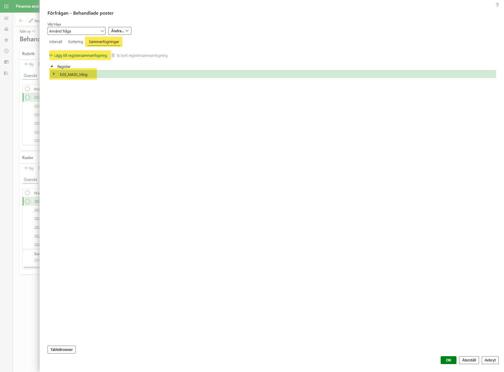 Klicka på Sammanfogningar, markera raden EGS_MASS_Inlog och klicka därefter på +Lägg till registersammanfogning: