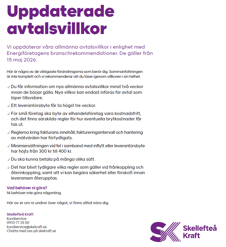 Information i Teamstavla AO Marknad alla med hänvisning till kundo-guide: Nya Allmänna avtalsvillkor Elhandel näringsidkare (Elhandel N 2025) | Kundservice Kunskapsbank - Skellefteå Kraft samt info till kundservice via informationssidan på intranätet.