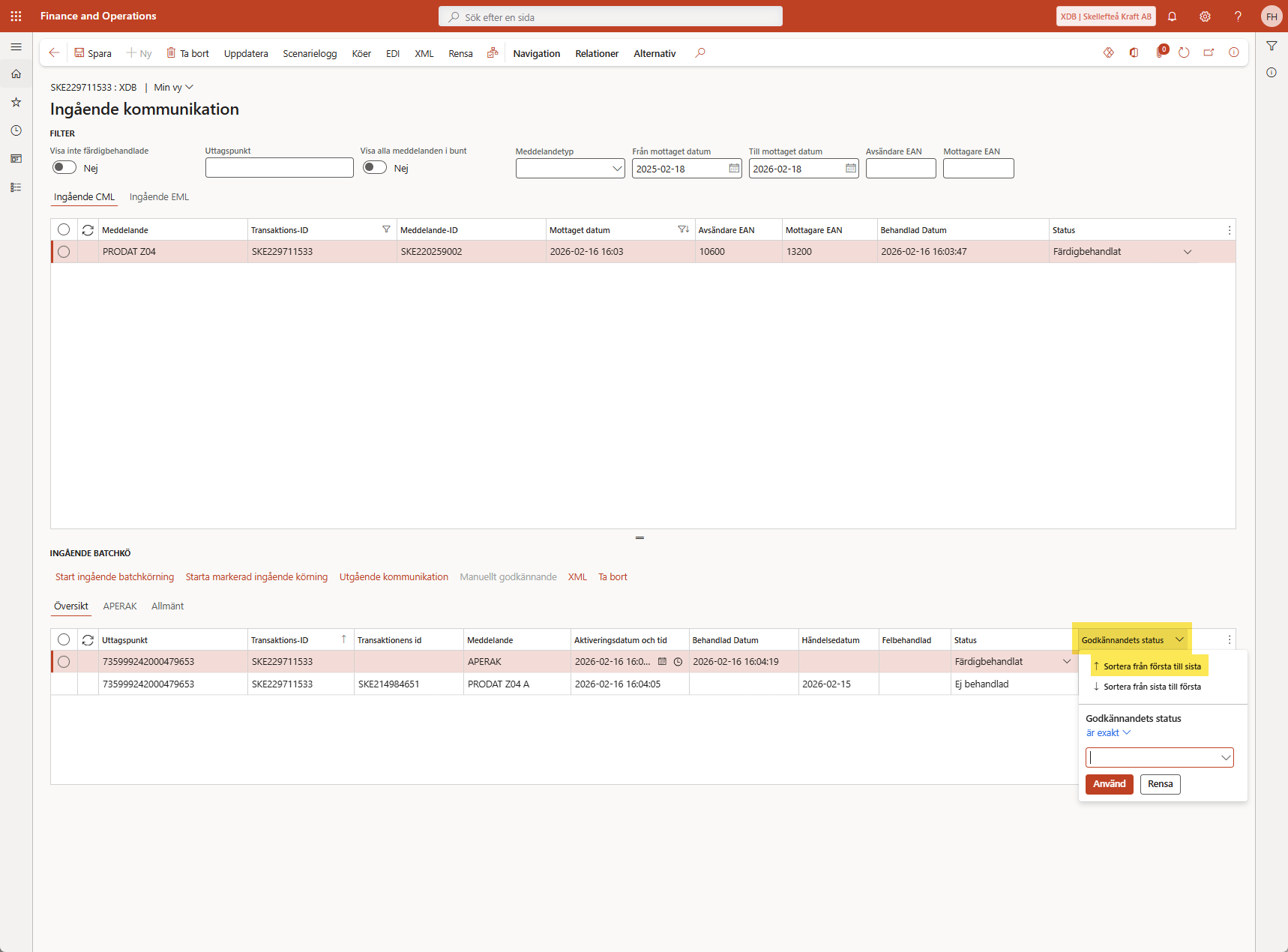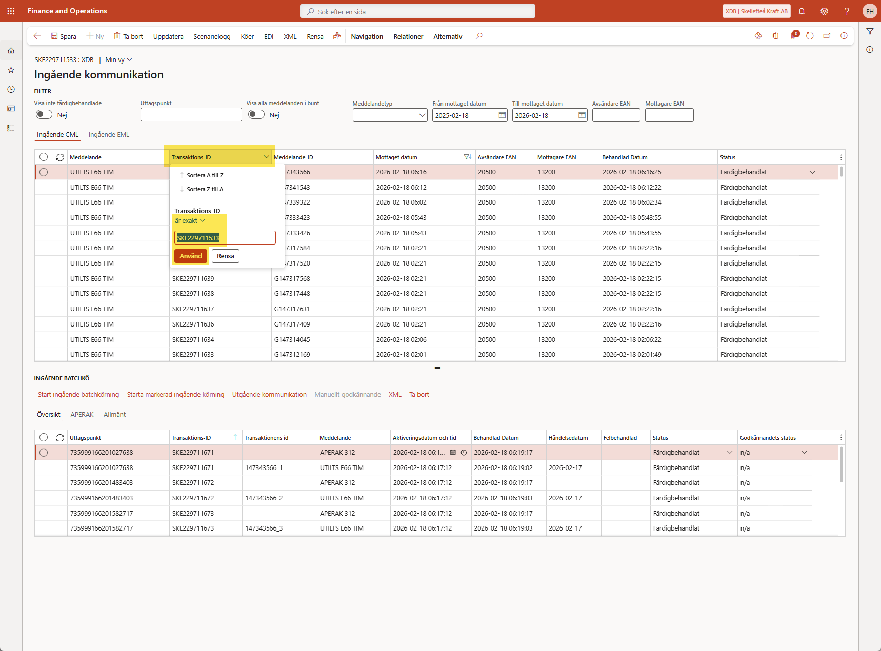 Jobbet börjar med att navigera till Ingående kommunikation i D365 och klickar på Transaktions-ID. Här filtrerar PA fram ett transaktionsid (en lista matas till PA via databasen):