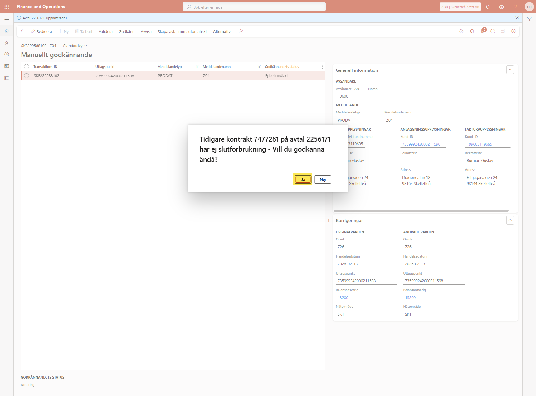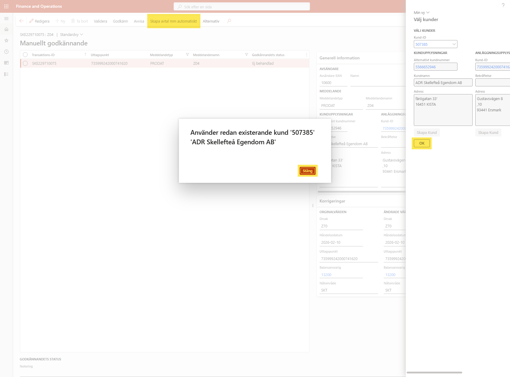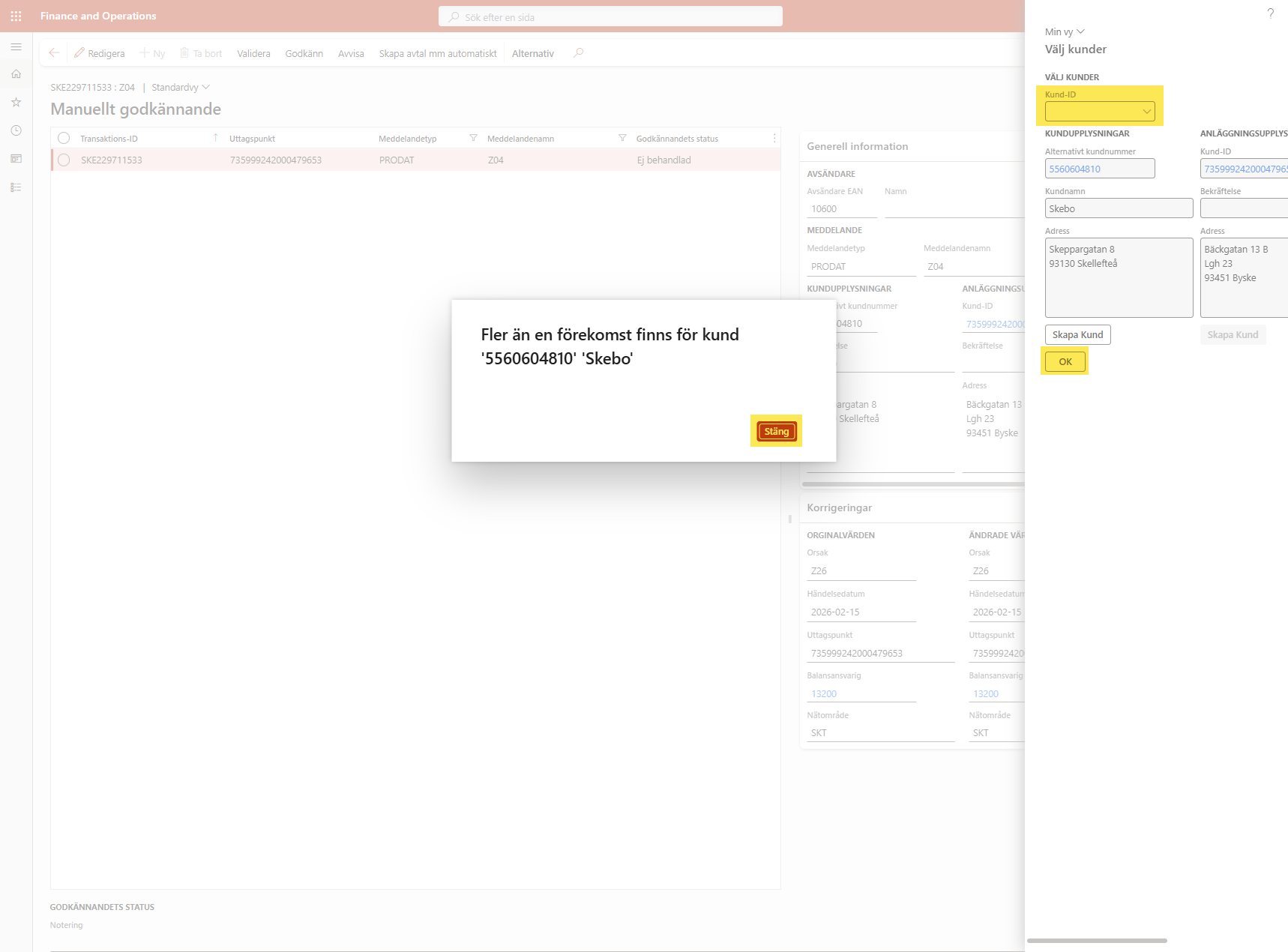 Om felet som PA rättar i loggen är "Har flera förekomster" så klickar PA Stäng på kontrollrutan och söker därefter fram rätt Kund-ID med hjälp av anläggningsid. PA klistrar sedan in Kund-ID i rutan och klickar på OK: