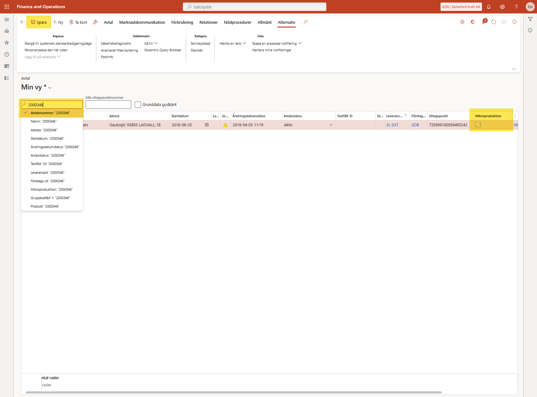 PA-jobbet börjar med att navigera till Alla avtal i D365. Här filtrerar PA fram ett avtalsid (en lista matas till PA via databasen). PA bockar sedan i rutan "Mikroproduktion" och klickar på Spara: