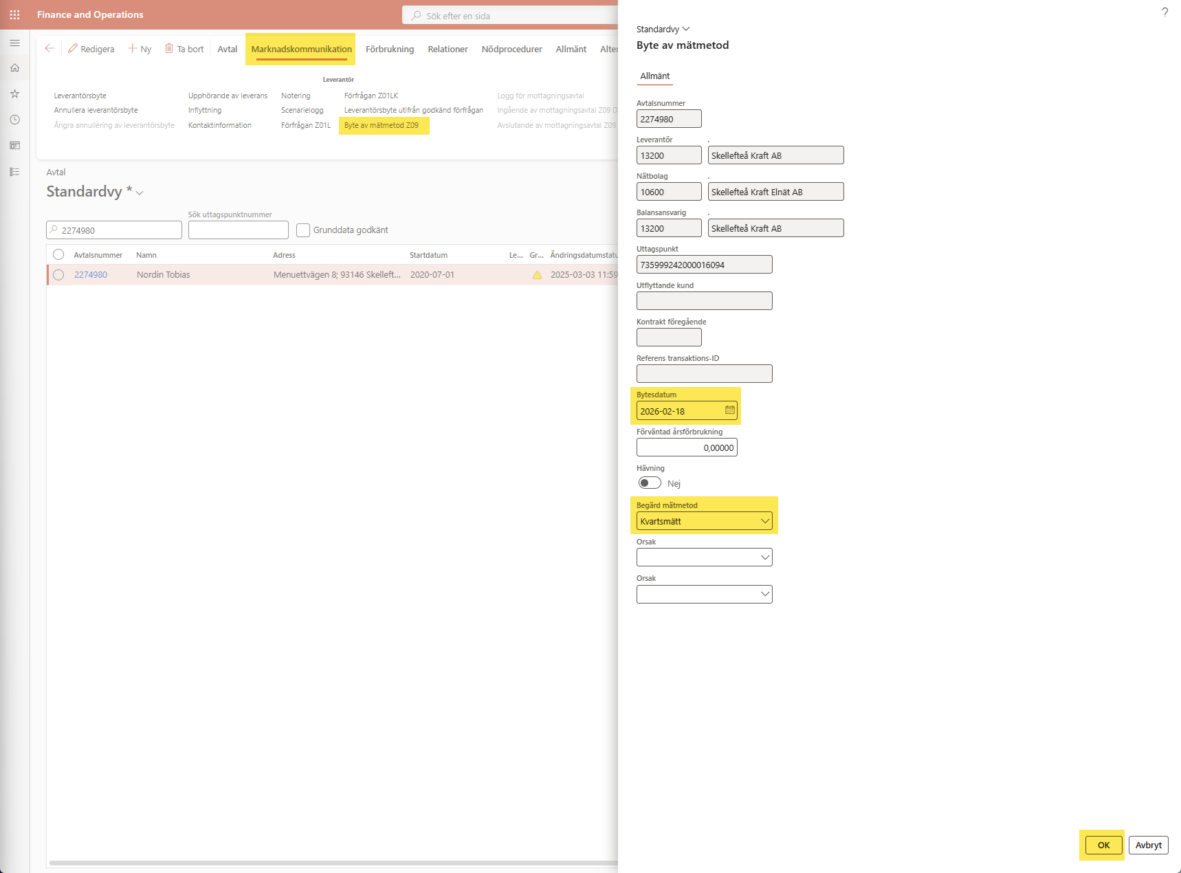 Därefter klickar PA på Marknadskommunikation > Byte av mätmetod Z09, fyller i bytesdatum, ändrar Begärd mätmetod till "Kvartsmätt" och klickar på OK: