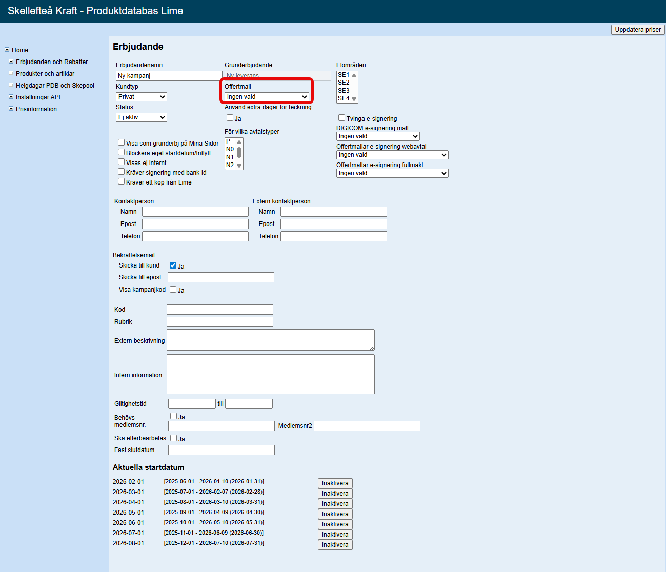 Fältet "Offertmall" används inte längre, så där kan du låta "Ingen vald" stå. Det finns fortfarande en del gamla kampanjer som har något ifyllt där, men det har ingen betydelse längre och ska inte fyllas i i någon ny kampanj: